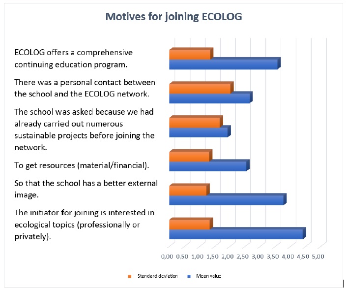 The main motivations for schools to join the ECOLOG Network are the personal and professional interest in ecological issues of the initiator (MW = 4.41; SD = 1.34), see figure 2. The second most pronounced motive is the improved external image of the school (MW = 3.78, SD = 1.23) followed by the motive of further education opportunities offered by ECOLOG (MW = 3.57, SD = 1.35). In order to analyse whether the mean values of the motives differ significantly from one another in the comparison groups (school types), a single-factor analysis of variance was performed. The analysis shows that the mean values do not differ significantly from one another, which is why a differentiated presentation based on the types of school is not provided.