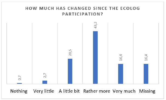 It is evident that the participating coordinators integrate ECOLOG into their everyday school life and can obviously identify with the contents. In general, a positive attitude can be seen among the participants (MW = > 3.50). ECOLOG is generally very strongly represented in everyday school life and has a high value at the schools (MW = > 3.00), but is relatively little discussed in conferences (MW = 2.96, SD = 1.22). Figure 3 shows that at 60 % of the participating schools rather more or very much has changed due to ECOLOG. This speaks for many perceived changes through the participation in ECOLOG.