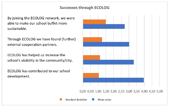 The following chart (4) shows which items were measured on the success scale. The positive contribution to school development through ECOLOG is particularly noteworthy (MW = 3.96, SD = 1.04). The transformation of the school buffet to a more sustainable one, on the other hand, is of less importance (MW = 2.73, SD = 1.49).