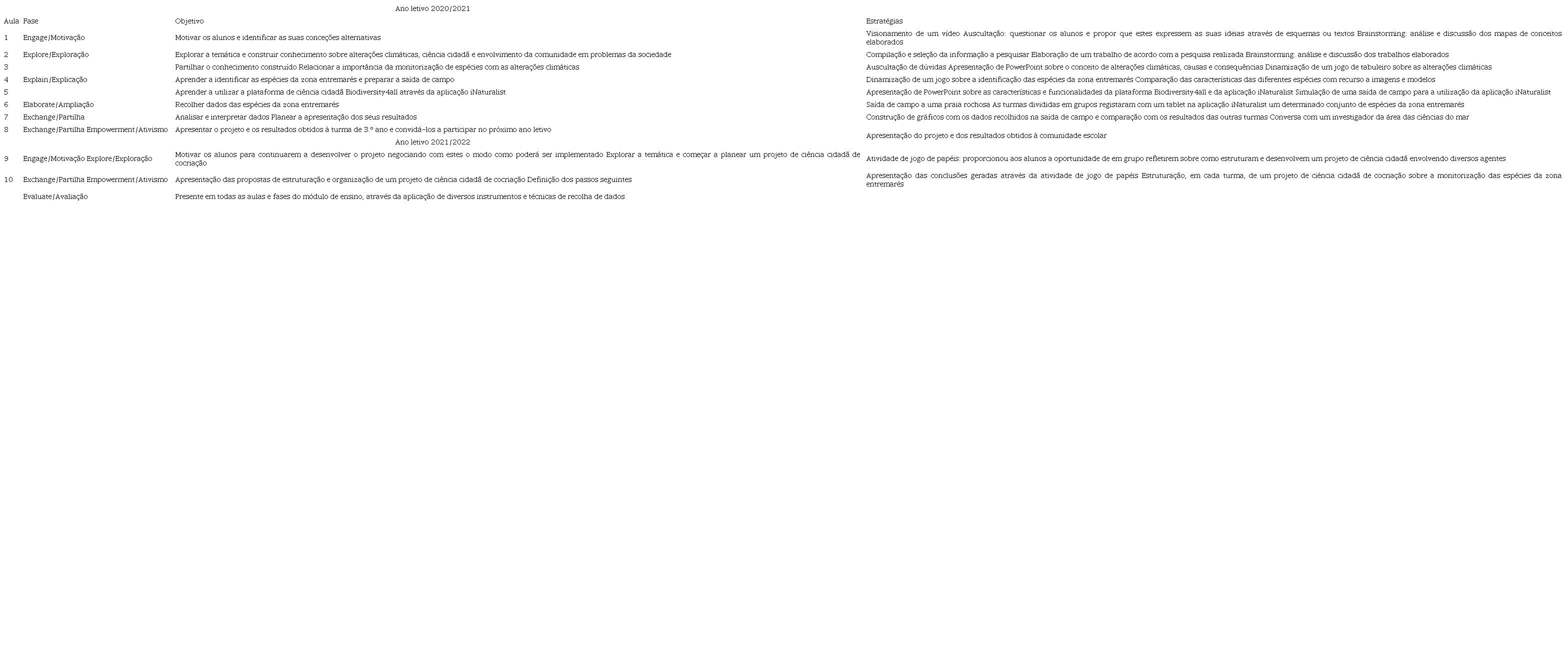Já na segunda parte do módulo, no ano letivo de 2021/2022, o projeto seguiu uma abordagem de cocriação, permitindo que alunos, professores e investigadores trabalhassem cooperativamente na estruturação de um projeto de ciência cidadã de monitorização das espécies da zona entremarés, que fosse adequado tanto à comunidade educativa como também à comunidade científica. Neste projeto foi utilizada a plataforma de ciência cidadã Biodiversity4all1 através da aplicação iNaturalist. A plataforma Biodiversity4all tem como objetivo aumentar o conhecimento sobre a biodiversidade nacional e envolver o maior número de pessoas possíveis na monitorização da biodiversidade local (Tiago, 2017) e encontra-se associada à rede iNaturalist2. No ano letivo 2020/2021 foram implementadas as primeiras 8 aulas do módulo entre os meses de outubro de 2020 e junho de 2021. No ano letivo seguinte, foram implementadas aulas 9 e 10 do módulo entre os meses de outubro e novembro de 2021. A tabela 1 apresenta uma síntese do módulo de ensino, tendo em conta as fases do modelo de ensino dos 7E, os objetivos de cada atividade do módulo e as respetivas estratégias.