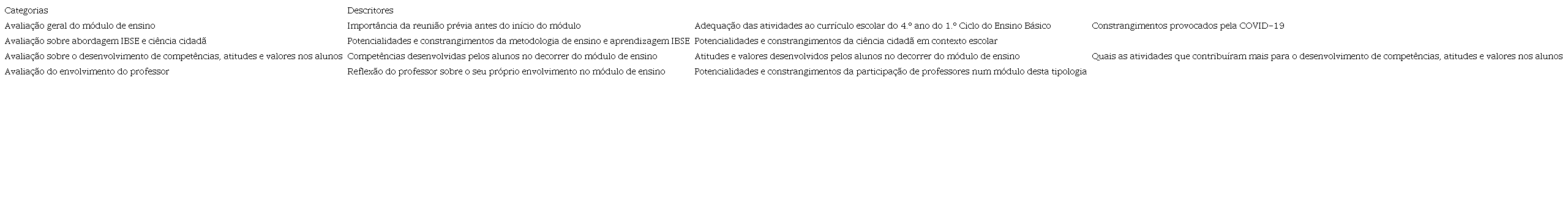 Nos inquéritos por questionário, para tratamento dos dados das questões de resposta fechada, realizou-se a análise das frequências de cada resposta com recurso ao SPSS (versão 27). Para a análise das questões de resposta aberta procedeu-se à análise de conteúdo das mesmas. Para o tratamento dos dados provenientes da transcrição das entrevistas procedeu-se à análise de conteúdo, com recurso ao software N-Vivo (versão 12). A análise teve em consideração as categorias definidas à priori tendo como base o guião de entrevista e também categorias que emergiram no decorrer da análise (tabela 3).