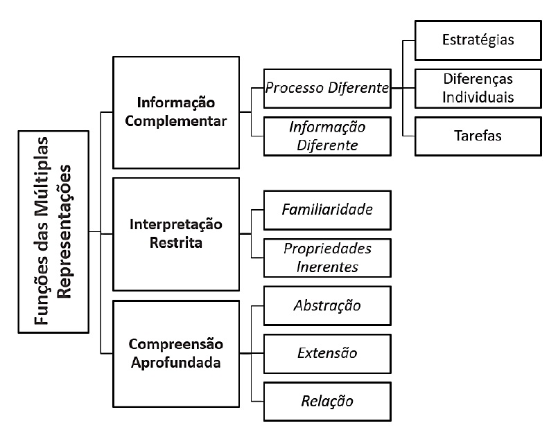 O uso das MRs dá oportunidade para os alunos aprenderem Ciências, em particular a Física (Opfermann et al., 2017). Ainsworth (1999, 2006, 2008) realizou uma análise dos ambientes de aprendizagem com o uso MRs e sugeriu uma taxonomia que inclui três funções principais das MRs: obter informação complementar, realizar interpretação restrita e construir compreensões aprofundadas sobre o tópico em estudo (Figura 1). Cada uma das funções pode ser subdividida em várias subclasses e, frequentemente, um único ambiente de MRs pode servir às distintas funções mostradas.