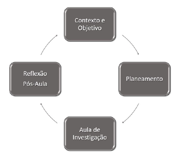 O estudo de aula, constituído por dezoito sessões, cada uma com duração de duas horas e meia, foi constituído de cinco etapas: (1) constituição teórica da abordagem dos estudos de aula e análise dos documentos legais da legislação educacional brasileira vigente; (2) análise de tarefas de investigação para sala de aula; (3) planeamento do plano de trabalho da primeira aula de investigação, reflexões e refinamento da atividade; (4) realização da primeira aula de investigação em sala de aula, reflexões pós-aula e revisão do planeamento do plano de trabalho; e (5) realização da segunda aula de investigação, reflexão pós-aula e finalização do plano de trabalho.