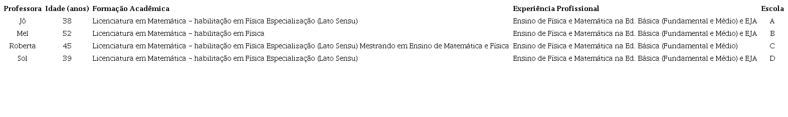 As participantes, Jô, Mel, Roberta e Sol,1 (Quadro 1), com idades compreendidas entre 38 e 52 anos, lecionam exclusivamente na rede pública de ensino do estado do Rio Grande do Sul (RS) e possuem entre 8 e 25 anos de experiência profissional na Educação Básica2, especificamente no Ensino Fundamental - anos finais - e Ensino Médio. As professoras atuam em escolas distintas2.