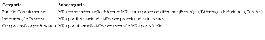 A categoria da função complementar das MRs envolve as subcategorias: (a) MRs como informação diferente e (b) MRs como processo diferente, contemplando as estratégias, diferenças individuais e tarefas. Na categoria da interpretação restrita das MRs estão as subcategorias: (a) MRs por familiaridade e (b) MRs por propriedades inerentes, contemplando distintas representações que foram utilizadas para encorajar a interpretação de uma representação mais complexa. A categoria da compreensão aprofundada das MRs apoia-se nas subcategorias: (a) MRs por abstração; (b) MRs por extensão e (c) MRs por relação, contemplando a busca pela compreensão mais aprofundada, direcionando ao processo de generalização da Lei de Ohm.