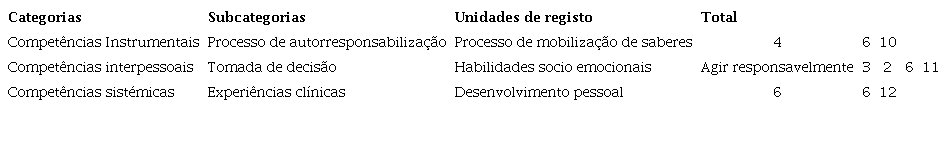 A análise de dados baseou-se nas gravações dos conteúdos áudios do grupo focal. Foi seguida a metodologia de análise de conteúdo segundo Bardin (2018), a qual se constitui em três etapas: organização da análise, codificação e categorização. Na primeira, realizou-se a leitura flutuante. A codificação consistiu na separação em unidade temática, com categorias prévias (dedutiva, pois o processo analítico foi conduzido sobre um foco específico, por meio de categorias determinadas a priori), do que foi mencionado pelos ECLE (Queiroz & Graça, 2013) e que expressavam as ideias subjacentes em cada Unidade de Registo (UR). A categorização dos dados em categorias estão de acordo com a intersecção entre as competências tunning e as competências do enfermeiro de cuidados gerais: competências instrumentais, que estão associadas ao domínio da prestação de cuidados; competências interpessoais, dirigidas ao domínio da prática profissional e ética e legal; e as competências sistémicas, integradas no domínio do desenvolvimento pessoal (Marques, 2019; OE, 2015) e consistiu em analisar como as informações se coadunavam com os objetivos da investigação, para só então começar o processo de aglutinação (Queiroz & Graça, 2013). Tendo como objetivo garantir a credibilidade e o rigor deste estudo, foram tidos em conta os cinco critérios estipulados por Leininger (2007) e assegurou-se a validade e confiabilidade, como critérios de qualidade de uma investigação qualitativa (Yin, 2015).