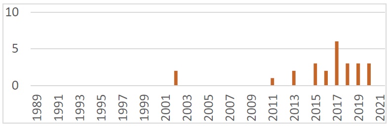 A distribuição cronológica (Figura 4) permite perceber a inexistência de publicações anteriores a 2002, registando-se o início de alguma regularidade apenas a partir de 2015.