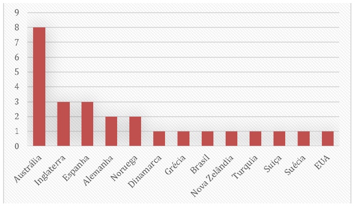 A distribuição geográfica (Figura 5) é bastante diversificada, sendo a Austrália o país de implementação do maior número de estudos. Verifica-se também a inexistência de estudos desenvolvidos em contexto nacional e apenas um estudo desenvolvido no Brasil.