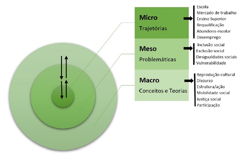 Conforme foi referido, o diagrama apresentado pela Figura 6 ilustra os diferentes níveis de complexidade da análise social. Dada a relação de interdependência entre os referidos níveis, representada pelas setas, o estudo destes percursos tem em consideração problemáticas de inclusão social, de exclusão social, de desigualdades sociais e de contextos de vulnerabilidade, também elas relacionadas entre si. Estas são discutidas ao nível mesossociológico, tendo em atenção as interações entre grupos e organizações sociais (Rosado, 2017, p. 41), i.e., as “relações entre atores coletivos e atos coletivos” (Pires, 2014, p. 33). Num plano mais amplo e complexo, a nível macrossociológico, analisa-se a forma como as interações de diferentes subsistemas sociais “determinam a configuração da sociedade” (Rosado, 2017, p. 41), estudando as relações entre propriedades das relações entre pessoas e entre grupos (Pires, 2017, p. 41). Enquadramos, assim, as problemáticas discutidas nos artigos selecionados em teorias defendidas por autores de referência.