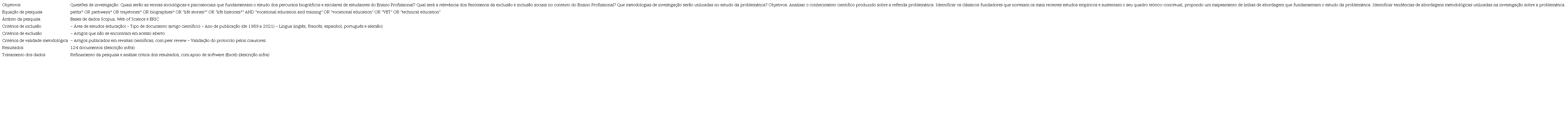 É ainda de referir que, dada a inexistência de resultados sobre estudos desenvolvidos no contexto português, procedeu-se paralelamente à adaptação da pesquisa no portal RCAAP (Repositórios Científicos de Acesso Aberto em Portugal), de forma exploratória. Recorreu-se a diferentes estratégias de pesquisa, nomeadamente, associando os termos “percursos” e “ensino profissional”, “ensino profissional” e “inclusão social” ou “exclusão social”. No entanto, no que diz respeito a artigos publicados em acesso aberto, em revistas científicas, não foram encontrados resultados.