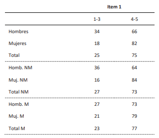 En el caso de los sujetos que no han estudiado música en la enseñanza especializada los valores alcanzan un 73% para el total de los sujetos en las puntuaciones 4 o 5 (interesante o muy interesante), y los valores según el género serían un 64% en el caso de los hombres y un 84% en el caso de las mujeres. En la misma tabla 1 se muestran estos valores.