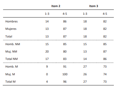 Los datos extraídos de la correlación de Pearson para estos ítems se expresan en la tabla 5. Aquí se muestran los valores correspondientes a todos los sujetos participantes y a cada uno de los dos grupos considerados.