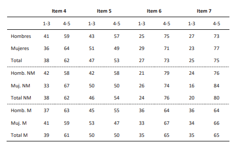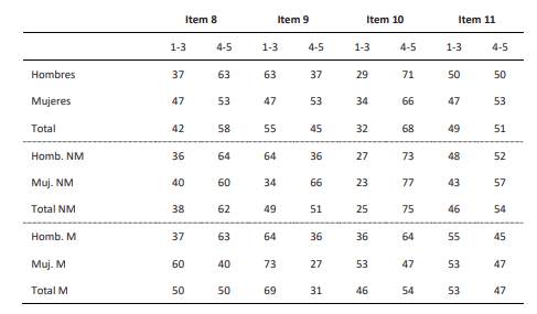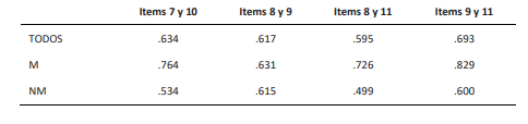 Además, se analiza la correlación entre algunos ítems para verificar la estabilidad de las respuestas dadas por el alumnado. Estas correlaciones se analizan entre los ítems 7 y 10, por un lado, y 8, 9 y 11, por otro.