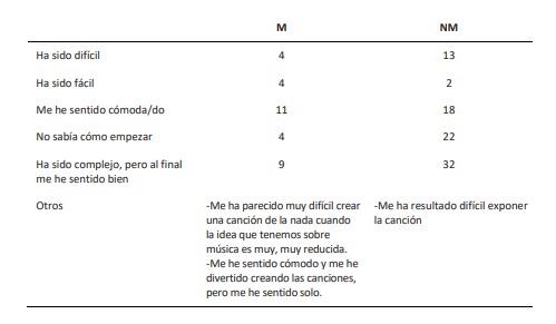Todos estos comentarios señalados anteriormente son extraídos del grupo que reconoce no haber estudiado música fuera del ámbito de la enseñanza general. Entre los que han estudiado en enseñanza especializada encontramos comentarios como “ha sido una experiencia maravillosa”, “ha sido bonito crear una canción” o “me ha gustado mucho la experiencia y la canción, pero a la hora de cantarlo por nervios nos equivocamos bastante y podía haber salido mejor”.