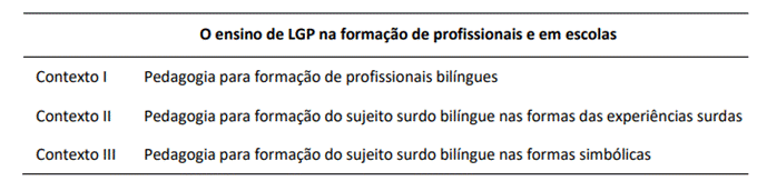 Já no contexto III, o ensino de LGP se desenvolve como L1, com práticas e uso da LGP ligados à vida das pessoas surdas em sua interação social com o mundo, explorando os conhecimentos sociais presentes nas diversas formas no nosso modo de vida. Este ensino foca-se na formação do sujeito surdo bilíngue que acessa as diversas formas simbólicas na interação social com o mundo.
