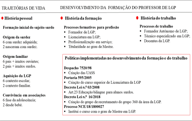 As trajetórias de vidas resultam da narração de um conjunto de eventos decorridos na história de vida das pessoas, contadas pelos próprios, que se desvelam através do relato de acontecimentos, espaços e tempos ao longo das suas vivências. As trajetórias de vida revelam, assim, parte da história pessoal por meio da formação inicial do sujeito surdo apresentando informações sobre a origem da surdez, a origem familiar, a aquisição da LGP e a convivência em associações de surdos. Já o desenvolvimento da formação do professor de LGP apresenta dados da história da formação e da história do trabalho constituídos no desenvolvimento da profissão de professores de LGP.