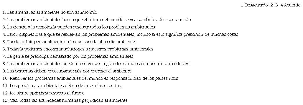 Se aplicó un cuestionario planteado por el proyecto ROSES-2021 que indaga múltiples experiencias relacionadas con la CyT. En particular, fue considerada la escala “Yo y el ambiente” que presenta 13 ítems controversiales que describen diferentes aspectos actitudinales acerca del ambiente y su relación con NdC (1) (Manassero-Mas & Vázquez-Alonso, 2024). Para cada ítem, que se representa como una frase, el estudiantado debe responder la siguiente pregunta: ¿Hasta qué punto estás de acuerdo con las siguientes afirmaciones? Las respuestas se presentan sobre una escala Likert de cuatro puntos (1-desacuerdo, 2, 3, 4-acuerdo) (Manassero-Mas & Vázquez-Alonso, 2023). El resultado de las frases se expresa en términos de porcentaje de acuerdo y desacuerdo.