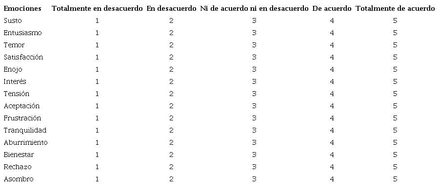 Se diseñó un cuestionario ad hoc que recoge sexo, edad y acceso a estudios universitarios, así como grado de acuerdo señalado en una escala Likert de cinco puntos acerca de la intensidad de siete emociones negativas (susto, temor, enojo, tensión, frustración, aburrimiento y rechazo) y siete emociones positivas (entusiasmo, satisfacción, interés, aceptación, tranquilidad, bienestar y asombro) que manifiestan frente a los contenidos científicos, considerando los momentos antes, durante y después de la intervención (ver anexo). La elección de variables aduce a emociones discretas con carácter académico que se relacionan con actividades de rendimiento y resultados de logro como éxito o fracaso (Pekrun et al., 2017).