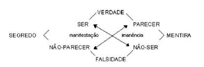 Com isso em mente, podemos construir um quadro veridictório que define a relação desses sujeitos participantes do contrato manipulatório e que nos auxilia na avaliação desse jogo de máscaras que vai sendo tecido entre segredos e mentiras, que são ou não reveladas no desenrolar do programa narrativo (FIORIN, 2005, p. 31). Como base, temos uma relação de oposição entre dois valores modais, de um lado a questão do /ser/, e de outro, a do /parecer/: