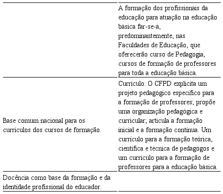 [...] a) a necessidade de revisão principalmente no tocante à carga horária, às disciplinas do campo da educação e à incorporação da base comum nacional na organização curricular de todas as licenciaturas. b) análise, das experiências de formação em desenvolvimento nas IES, e o impacto das novas regulamentações sobre a organização acadêmica e institucional e na estrutura curricular. c) o estudo de novas formas de organização acadêmica e institucional das IES, redefinindo o papel das Faculdades/Centros/Departamentos de Educação e sua responsabilidade como lócus privilegiado da formação de professores. d) a formação dos profissionais da educação, articulada aos sistemas de ensino (ANFOPE, 2006, p. 18).