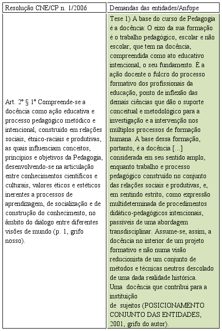 Nesse debate de disputas e enfrentamentos, a ANFOPE reconhece que “na formação inicial, cabe destacar a aprovação das Diretrizes de Pedagogia após um período de 7 anos de enfrentamento com o MEC e CNE” (ANFOPE, 2006, p. 15). Argumentamos que a tese da docência apresenta-se como uma demanda hegemônica que disputa os sentidos em torno da