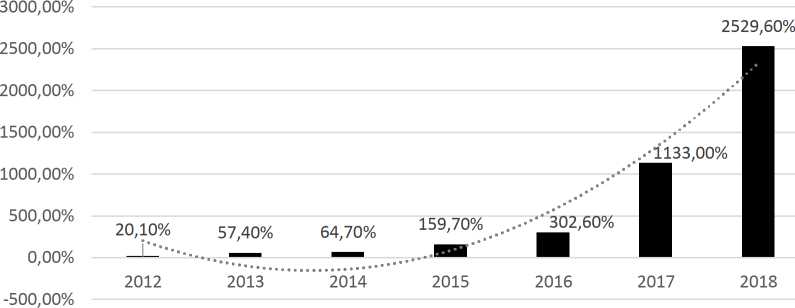 PORCENTAJE DE INCREMENTO Polinomial (PORCENTAJE DE INCREMENTODevaluación y salario mínimo: como análisis final del ítem económico y en complemento del anterior se plasma la manera cómo la relación del valor de adquisición de la canasta familiar supera hasta en cinco veces el valor del salario mínimo, es decir una persona debería ganar cinco salarios mínimos, o en una familia deben haber cinco aportantes para poder suplir las necesidades básicas. Alrededor de este planteamiento se menciona de manera enfática el proceder de las entidades implicadas, las cuales niegan cualquier hecho que acepte que esta es la situación actual (Castillo; Reguant, 2017). Con base en lo anterior se puede percibir que la situación venezolana ha dejado de ser una problemática de algunos sectores para convertirse en un fenómeno de la cotidianidad.