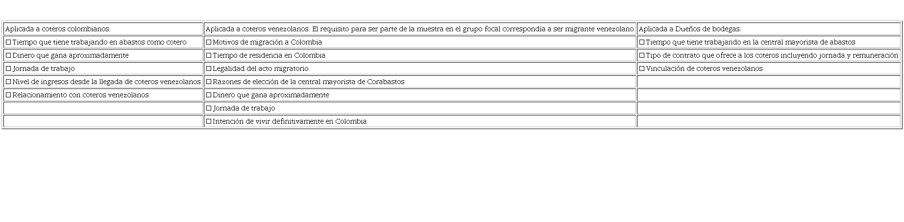 Como herramienta de recolección de datos se utilizó una entrevista semiestructurada con preguntas ordenadas tipo cuestionario, que indagan por información referente a las condiciones de laboralidad y convivencia entre los migrantes venezolanos con los demás grupos de interés y sus comentarios frente a las percepciones de la ciudadanía frente a su presencia. Las entrevistas se realizaron directamente en la central mayorista, de manera personalizada, en algunos casos con soporte audiovisual en calidad de evidencia - a una muestra de 250 coteros que representa el 10% de una población de 2.500 coteros, con un margen de error del 5,9%. Seleccionados de manera aleatoria simple, 125 coteros colombianos y 125 coteros venezolanos y una muestra de cinco dueños de bodega, de una población de 32, correspondiente al 15,62% de la población, con un 95% de confianza, seleccionados de manera aleatoria simple. Se aplicó el instrumento en el mes de julio. El procedimiento consistió en abordar los puntos de concentración al momento del descanso de cada zona y abordarlos explicando la naturaleza y objetivo del estudio, luego se inició el diálogo en el que cada entrevistador iba formulano las preguntas en su respectivo orden y se realizaba registro de las respuestas. Las variables a evaluar para cada grupo fueron: