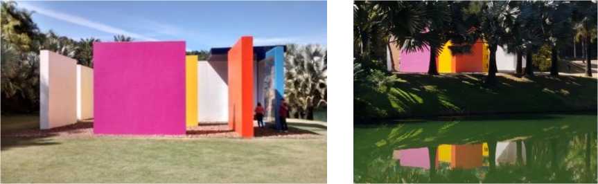 A obra Invenção da Cor -Penetrável -Magic Square # 5- De Luxe (1977-2006) trata-se de uma instalação elaborada em diversas etapas (a partir de 1977), e apresentada no Inhotim em 2006. Artista: Hélio Oiticica (1937 - Rio de Janeiro, 1980 - Rio de Janeiro). A obra, através de uma estrutura arquitetônica de grandes dimensões, é composta por nove peças quadriláteras coloridas, isto é, nove paredes coloridas dispostas ortogonalmente ao solo e uma em paralelo como um “teto” para duas delas. Conforme Stori e Pelaes (2017), a obra de Oiticica, rompe com paradigmas, através da proposta dos “Penetráveis”, dando ao público a oportunidade de interagir com a obra e com seu entorno, revelando-se através das relações cromáticas estabelecidas pelas paredes que irradiam cores vibrantes, apresentando grande intensidade na relação entre as cores e formas. A obra foi construída em meio aos jardins (área de 15m2) e perto de um dos lagos, permitindo a criação de um diálogo com o meio ambiente e com seus observadores e fruidores, como segue nas figuras 6 e 7.