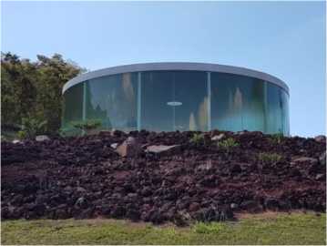 A obra Sonic Pavillion (2004), “Som da terra”, do artista plástico premiado Doug Aitken (1968, Califórnia- EUA) foi construída numa proposta baseada no estudo dos ruídos e reverberações da terra do Instituto. Sonic Pavillion consiste num pavilhão de vidro e aço, revestido de película plástica; poço tubular de 200 m de profundidade, microfones e equipamento de amplificação sonora. É uma obra Site-specific, expressão já explicitada anteriormente, que foi desenvolvida a partir de uma ideia pré-existente e o resultado de um processo de cinco anos divididos entre pesquisa, projeto e construção Vide figuras 13 a 15.