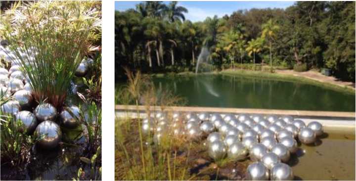 A obra Narcissus Garden Inhotim (2009), da artista Yayoi Kusama (1929, Matsumoto, Nagano- Japão), é composta por 500 esferas brilhantes de aço inoxidável que flutuam nos espelhos d'água, constituindo uma instalação ambiental. Narcissus Garden trata-se de um conjunto de obras que foram criadas em diferentes versões para exposições em museus e espaços públicos nos últimos anos e, no Inhotim, a obra faz sua primeira aparição no Brasil. Construída com base na narrativa do mito de Narciso, que se encanta pela própria imagem projetada na superfície da água, a obra constrói sua materialidade pelo espelhamento que produz uma relação conceitual com o observador e o seu entorno. Segundo Pelaes (2017), a obra é composta por esferas que produzem, numa ação exponencial, centenas de pequenos espelhos convexos, que distorcem, fragmentam e, sobretudo, multiplicam a imagem daquele que as contempla, contemplando, assim, necessariamente a si próprio. O fazem numa visão multiplicada de si mesmo e, portanto, numa perspectiva incomum. Vide figuras 16 e 17.