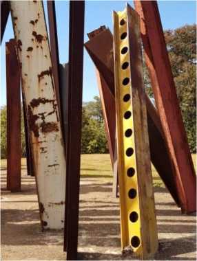 A obra Beam Drop Inhotim foi confeccionada com a ajuda de um guindaste. Chris Burden e uma equipe de empreiteiros içaram 71 vigas de aço antigas a uma altura de 45