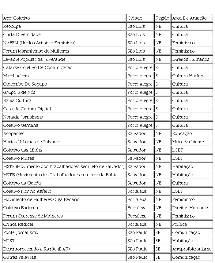 A pesquisa teve duas fases principais: a primeira consistiu no levantamento de informações sobre coletivos e movimentos sociais brasileiros e sua inserção num banco de dados; na segunda, foram feitas entrevistas3 com 40 atores coletivos dos estados de São Paulo, Bahia, Maranhão, Rio Grande do Sul, Ceará e Mato Grosso do Sul, de onde provém nosso material empírico. Os atores coletivos foram selecionados tanto com base na relevância de sua atuação na região quanto à disponibilidade em conceder a entrevista. Nesse sentido, o quadro de entrevistas não pode ser considerado representativo das regiões devido às limitações explicitadas.