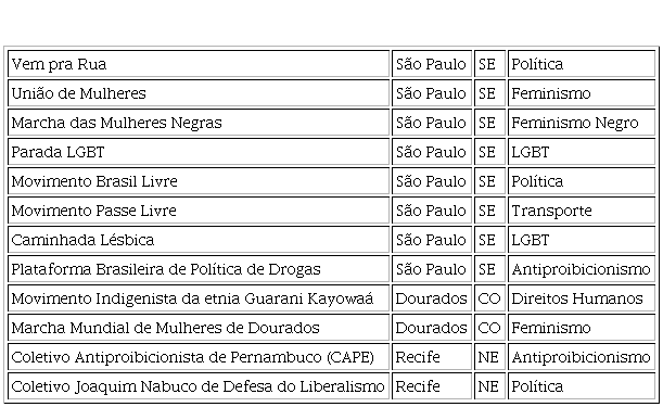 Keywords: Social movements, collectives, political activism, cultural activism, horizontalidade, political representation.
