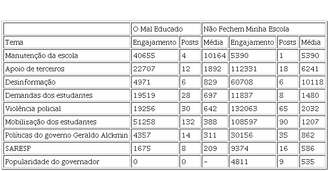 As categorias de temas foram definidas a posteriori. Entre os temas foram identificados: Manutenção da escola, Apoio de terceiros, Desinformação, Demandas dos estudantes, Violência policial, Mobilização dos estudantes, Políticas adotadas pelo governo Geraldo Alckmin, SARESP e Popularidade do governador Geraldo Alckmin. Foram classificados com o tema “Manutenção da escola” posts específicos sobre estudantes realizando ações de conservação de infraestrutura das dependências da escola. A categoria “Apoio de terceiros” reúne publicações que apresentam demonstrações de apoio por parte de cidadãos, personalidades, organizações e movimentos sociais. Sob o tema “Desinformação” foram englobados posts que buscavam desmentir ou corrigir informações erroneamente passadas por terceiros, usualmente emitidas pelo então Governador do Estado de São Paulo, Geraldo Alckmin. As publicações classificadas com “Demandas dos estudantes” agregam mensagens que tratam das pautas elaboradas pelos secundaristas. O tema “Violência policial” se refere a posts que reúnem conteúdos sobre abuso de autoridade e atos de violência praticados pela Polícia Militar do Estado de São Paulo contra alunos, professores e cidadãos envolvidos nas ocupações. A categoria “Mobilização dos estudantes” abrange publicações relativas a ocupações bem sucedidas, atos, protestos, marchas realizadas pelos secundaristas e outras ações relacionadas às ocupações. A categoria “Políticas adotadas pelo governo Geraldo Alckmin” se refere a posts que discutem a composição da pasta da Educação no Estado de São Paulo e medidas derivadas do posicionamento político do governador. O tema “SARESP” engloba publicações que discutem a prova do Sistema de Avaliação do Rendimento Escolar do Estado de São Paulo, uma vez que uma das maneiras de se mobilizarem contra a reorganização foi através do boicote à esta prova: em 2015 os manifestantes secundaristas concordaram em realizar um boicote contra o SARESP como forma de protesto contra as políticas educacionais do Governo do Estado de São Paulo. Por fim, a “Popularidade do governador Geraldo Alckmin” é também um tema identificado nas publicações dos coletivos.