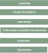 Conforme destacam os autores do documento, os eixos “cultura”, “inovação” e “extensão” medem o que, substancialmente, influencia no empreendedorismo de uma universidade e os eixos “infraestrutura”, “internacionalização” e “capital financeiro” medem os meios que facilitam o desenvolvimento do protagonismo acadêmico (Brasil Junior et al, 2016).