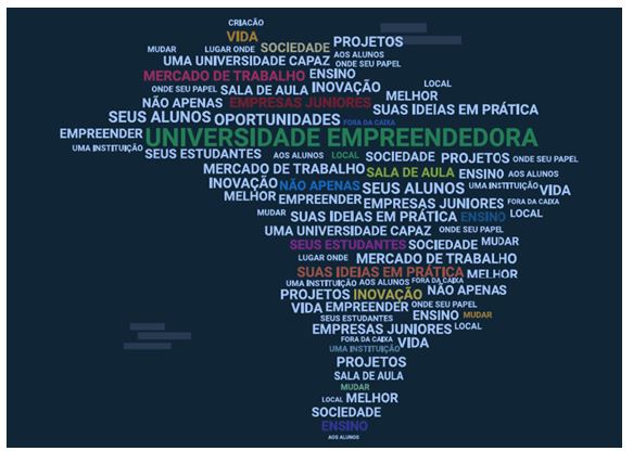 Frente a isso, os autores do documento trazem uma imagem (figura 1) que reúne diferentes palavras, as quais expressam o que os respondentes da pesquisa entendem como sendo uma universidade empreendedora.