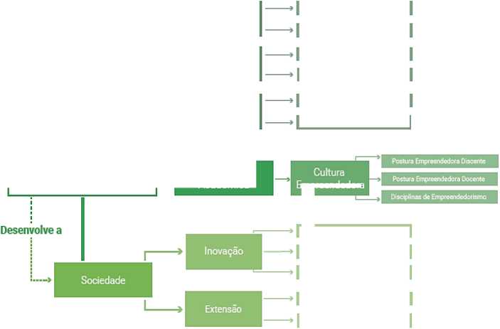 Na figura 2 abaixo é possível vislumbrar, assim, os principais eixos - e seus respectivos indicadores - que compõem a universidade empreendedora no Brasil, quais sejam: cultura empreendedora, extensão, inovação, infraestrutura, internacionalização e capital financeiro.