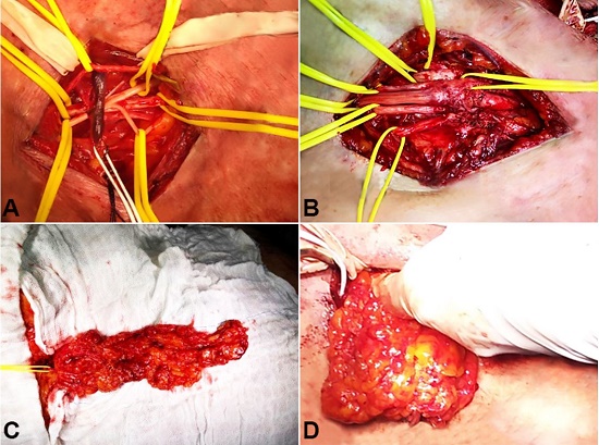 The patient was submitted to a supraclavicular and infraclavicular surgical exploration of the brachial plexus. The main intra-operative findings were (i) fibrotic tissue adhered to all elements of the supra clavicular brachial plexus (Figure 1A), and (ii) there was a neuroma in continuity in the lateral cord (Figure 1B). Under magnification, an extensive external micro neurolysis was performed. Next, a graft of omentum was harvested through a median supra umbilical laparotomy (Figure 1C), and its vascular pedicle was anastomosed to the cervical transverse vessels. The graft was placed over all elements of the brachial plexus (Figure 1D).