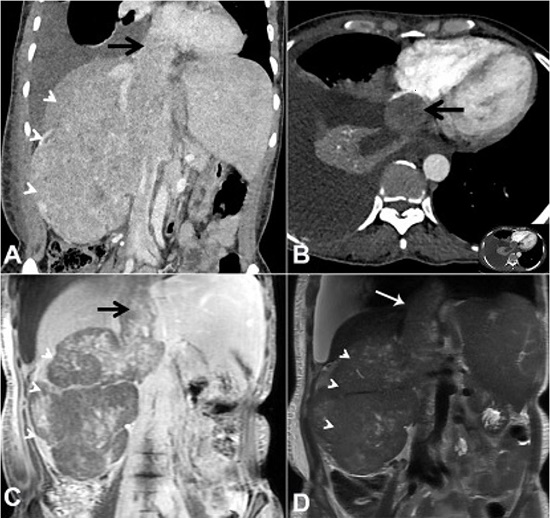 Classic AMLs, particularly the larger ones, can rarely have involvement of the renal vein or IVC. This might be attributed to multifocal genesis of tumor, instead of direct vascular involvement.14 The first case of renal AML with IVC was reported by Kutcher et al.,15 and the first case of renal AML with extension to heart was reported by Rothenberg et al.16 Riviere et al.,6 in their review, found that among patients with AML, 44 had IVC extension and most of them had large tumors (>4 cm) at presentation and more than 67% of patients were symptomatic. The median age of presentation was 46.6 years, and only seven patients had right atrial extension and all of them were female.