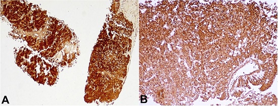 The current diagnostic methods include ultrasound, Computed Tomography (CT) and Magnetic Resonance Imaging (MRI). Because of its fat component, the preferred diagnostic method for AML is CT.17 The fat content appears as hypodensity on CT and as a hyperechoic signal on sonography.18 Approximately 5% of AMLs lack fat and, therefore, cannot be differentiated from RCCs. Due to their peculiar characteristics, EAMLs resemble conventional RCC either histologically and radiologically, and have similar cytologic features on fine-needle aspiration.19 EAMLs and RCC both frequently present with vague flank pain, a palpable mass or hematuria.20 The definitive method for the differential diagnosis between EAMLs and RCC is based on immunohistochemical markers. RCCs are immunoreactive for PAX-8, cytokeratin and EMA, which are negative in EAMLs. By contrast, EAMLs show co-expression of melanocytic markers (HMB-45 and melan-A) and myoid markers (SMA, MSA, calponin and/or desmin), which are not found in RCC.12 However, one of the melanocytic marker, HMB-45, was negative in the present case. Although this is an infrequent finding, it is well reported in the literature. Aydin et al3, reported HMB-45 and Melan A positivity in 92% and 80% cases of EAMLs, respectively. In their study, expression of any one of these markers were noted in 100% cases. Isolated cases showing loss of HMB-45 expression in AML are also reported by Hohensee et al.21 and Lin et al.22 Hohensee et al,21 in their case, reported absence of both melanocytic markers on IHC in a case of renal EAML. Diagnosis was confirmed by presence of premelanosomes on electron microscopy examination. The authors ascribed lack of IHC expression for these antibodies to aberrant antigen expression in tumor tissue.