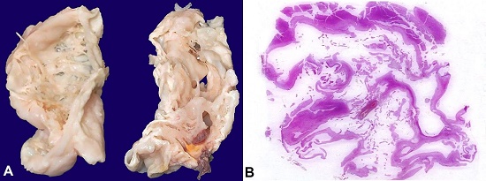 A small for gestational age male baby with a birth weight of 1138 g (Expected weight 1700 g) was born at 32 weeks following spontaneous onset of labor by preterm vaginal delivery. The baby cried immediately after birth with an Apgar score of 8 and 9. On day 3 of life, the baby developed feed intolerance, metabolic acidosis, and thrombocytopenia. He was managed as a case of Stage 2 necrotizing enterocolitis. He had episodes of hypoglycemia secondary to hyperinsulinemia, with blood culture being positive for E coli on Day 7. The neonate further developed conjugated jaundice and anemia requiring blood transfusion. He rapidly deteriorated with worsening of abdominal distension and sclerema. Septic shock and capillary leak syndrome preceded the demise of the baby on day 8. In retrospect, the baby was a gravida 2 neonate with no major antenatal problems. The brain at autopsy weighed 179 g (RR; 238+2 g). The gyral pattern was normal. Externally, the meninges were shriveled and collapsed over the parieto-occipital region (5x5x2cm) bilaterally because of the loss of brain parenchyma underneath. Otherwise, the meninges were congested and dull. Coronal slicing revealed multiple cysts in central white matter with peripheral thinned out the cortical ribbon. The right side was more affected than left, and the involvement was more severe in the posterior segments compared to the frontal region (Figure 2A). The brain stem and rest of the cerebellum were essentially normal. The microscopy of affected regions was similar to the first case. However, the cystic change was more marked with cavitation, and involvement was seen in the frontal lobes bilaterally, left basal ganglia, right insular cortex, and bilateral parietal lobes (Figure 2B). Sections from the brain stem revealed features of early ischemia. The extracranial organs, including the liver, demonstrated sinusoidal congestion and lungs showed features of hyaline membrane disease. The intestines did not show any specific pathology and the placenta was not available for examination. Sepsis was attributed as the possible etiological factor resulting in encephalomalacia.