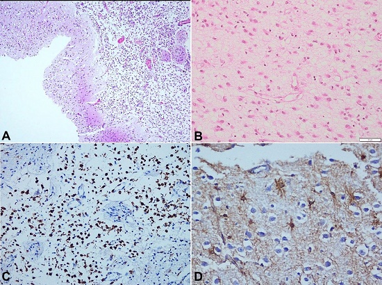 Secondary dilatation of lateral and third ventricle was noted. Similar cystic change was noted in the entire brain stem, including tectum of pons and medulla. Microscopically, the cystic spaces were bordered by microglial cells and gliosis with neuropil pallor and edema noted in the surrounding regions (Figure 4A). The gliotic areas showed prominent reactive gemistocytes highlighted by GFAP immunohistochemistry (Figure 44C). The microglial cells were highlighted by CD68 immunohistochemistry (Figure 4D). In the extracranial organs, bilateral pulmonary hypoplasia (Combined weight of 30 g, Lung /body weight of 1.8%, against normal of 2.25%) was noted. However, both kidneys were normal. The other organs were within normal limits and the placenta was not available for examination. Placental insufficiency was suspected to the possible etiology behind cystic encephalomalacia.