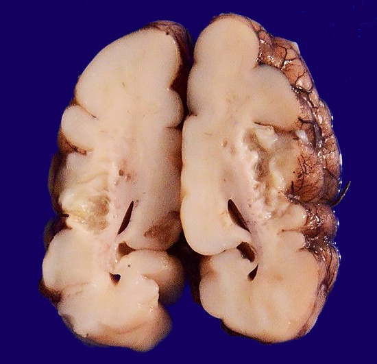 A 2210 g birth weight (Expected weight 2100 g) appropriate for gestational age male baby, was delivered at 34 weeks of pregnancy by vaginal delivery. The child cried immediately at birth with an Apgar of 8 and 9 (Scored at 1 and 5 minutes after birth). The child was started on breastfeeding on day 3 of life. On Day 21, the newborn was readmitted with complaints of poor feeding, lethargy, and respiratory distress for 3 days. The parents also gave history suggestive of seizures on 1 day. On examination, the child had severe encephalopathy with sluggish pupillary reflexes. Ultrasonography showed grade 3 intraventricular hemorrhage with bilateral cystic periventricular leukomalacia. Blood cultures showed growth of Enterococcus and group A beta-hemolytic streptococci. The cerebrospinal fluid analysis was indicative of meningitis. The baby showed improvement with antibiotics and supportive care and was discharged on oral feeds. A few days later on day 34, the baby was brought in a state of cardiac arrest and could not be revived. At autopsy, the brain showed normal gyral pattern; however, the meninges were collapsed over parietal regions. On coronal slicing, there was the presence of multiple cystic cavities in the central white matter, also involving the grey matter with resultant communicating hydrocephalus (Figure 5).