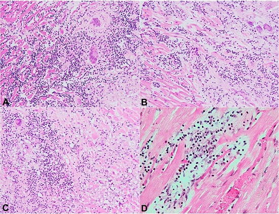 Three sections were taken for microscopic examination, and revealed geographic replacement of myocardium by confluent areas of central fibrosis and necrosis with scattered multinucleate giant cells and a leading edge with a mixed inflammatory infiltrate with lymphocytes, plasma cells, eosinophils, and giant cells with associated myocyte necrosis (Figures 222C). Additionally, there were some foci of nearby inflammation and myocyte necrosis in the absence of giant cells (Figure 2D). Sections of myocyte loss were seen extensively in the left ventricle and also in the right ventricular myocardium. No distinct, well-formed granulomas were noted. Moderate atherosclerotic coronary vascular disease was appreciated. Cardiomegaly was likely secondary to cardiac insufficiency in combination with increased organ stress due to giant cell deposits inhibiting cardiac contractility.