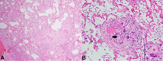 Three microscopic sections were submitted and showed scattered, well-defined, non-caseating granulomas with minimal associated inflammation throughout the parenchyma, some containing prominent asteroid bodies (Figure 3).