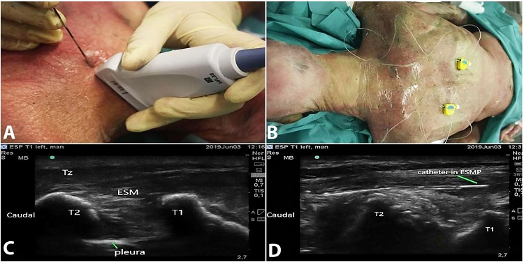 Cervical ESPB was performed on 2 prone cadavers successfully. The identification of the first thoracic CTJ was successful in both cadavers on both sides (Figure 1C). After injection of 10ml solution through the needle, the US images depicted a cranial spread in relation to the dorsal and medial edge of the first thoracic CTJ, deep to the anterior sheath of ESM and dorsal to the TPs. Catheters were visualized deep to the ESM. (Figure 1D).