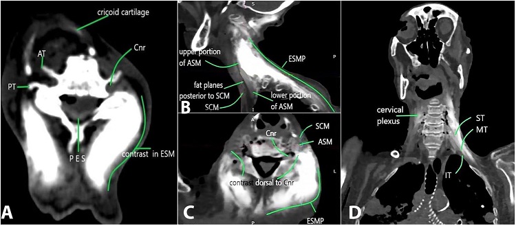 In cadaver 1, an epidural spread at the C5-6 and C6-7 was visualized in coronal and axial planes bilaterally (Figure 2A). In cadaver 2 in the sagittal section, the contrast delineated the ESM from the level of occiput up to T3-4 (Figure 2B). Contrast spread delineated the upper to mid portion of ASM and SCM muscle, but the fat plane beneath the SCM muscle was free of contrast (Figure 2B). The contrast from the ESP coursed from dorsal to ventral and engulfed the ASM and was visualized at SCM muscle (Figure 2B). In the axial view (Figure 2B), the spread from the left ESP was visualized at the superior surface of ASM and in the fat plane between the ASM and the SCM. In the coronal view (Figure 2C), an extensive bilateral cervico-brachial-thoracic spread was seen. The left superior, middle, and inferior brachial trunks are delineated (Figure 2D). On the right side, the contrast is observed in the cervical plexus (Figure 2D).