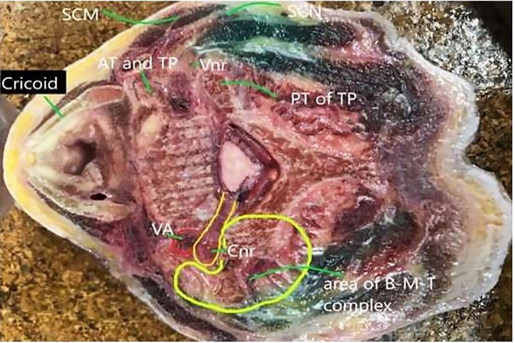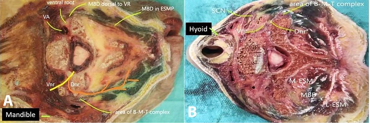 The cadaveric cross-sections performed at the level of the angle of the mandible (C2), at hyoid (C3), and the cricoid, i.e., C6 (Figure 3A, 3B and Figure 4) were grossly examined. A spread was observed dorsal to the ventral rami in all specimens at the level of the cricoid cartilage as the contrast traveled between the lateral and medial erector spinae group of muscles. A lateral spread was visible posterior to the SCM. No epidural spread was visible. No spread was visible at the extraneural foramina (beyond the tubercles along the nerve sheath), in the neural foramina (between the anterior and posterior tubercle), and at the ASM area.