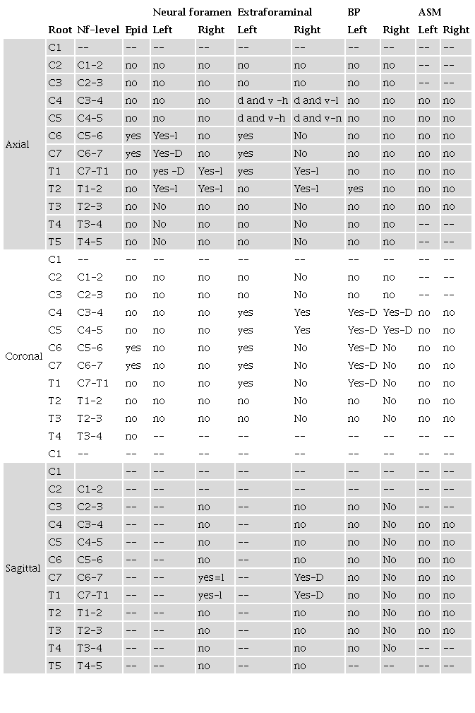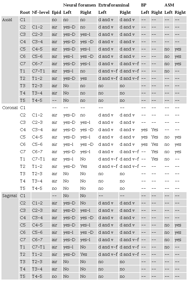 Both cadavers were transferred to the CT suite in a prone position. A cervical to thoracic CT scan was performed (head to T5-6). The distribution of injected volume was evaluated after a three-dimensional digital reconstruction in a computer program for Mac (OsiriX DICOM viewer, Pixelmon, Switzerland). Images obtained were analyzed by a radiologist in conjunction with an anesthesiologist who performed the blocks. A separate analysis was performed of each cadaver in axial, coronal, and sagittal planes to understand contrast spread in the following locations: epidural space, neural foramina, extraforaminal area, brachial plexus, medial most spread, lateral most spread, spread in relation to ASM and to SCM muscle.