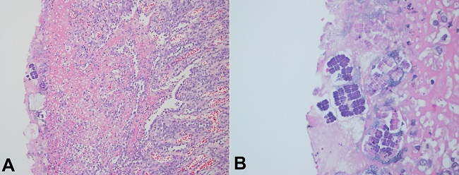 A 58-year-old male patient, a former smoker, was submitted to an upper gastrointestinal endoscopy due to epigastric pain in the past three months. Hemoglobin level was 10.8g/dL (reference range 12.8-17.8g/dL), and no other laboratory abnormality was detected. The upper gastrointestinal endoscopy demonstrated a non-obstructive neoplastic lesion in the antrum of the stomach, confirmed by biopsy as a diffuse gastric adenocarcinoma with signet-ring cells. CT scan revealed no distant metastasis, and patient was submitted to a partial gastrectomy. Anatomopathological analysis of the specimen confirmed a poorly differentiated adenocarcinoma, with 5.5cm at the distal stomach and extending through all gastric walls. There were free resection margins and no metastasis was seen in any of the seventeen lymph nodes (pT3 pN0). Sarcina ventriculi was identified at the mucosa (Figure 2A and 2B). The patient had a good recovery after the surgery, but was readmitted due to a wound infection, treated with local drainage and antibiotic therapy. He is currently receiving postoperative chemoradiotherapy (MacDonald regimen).
